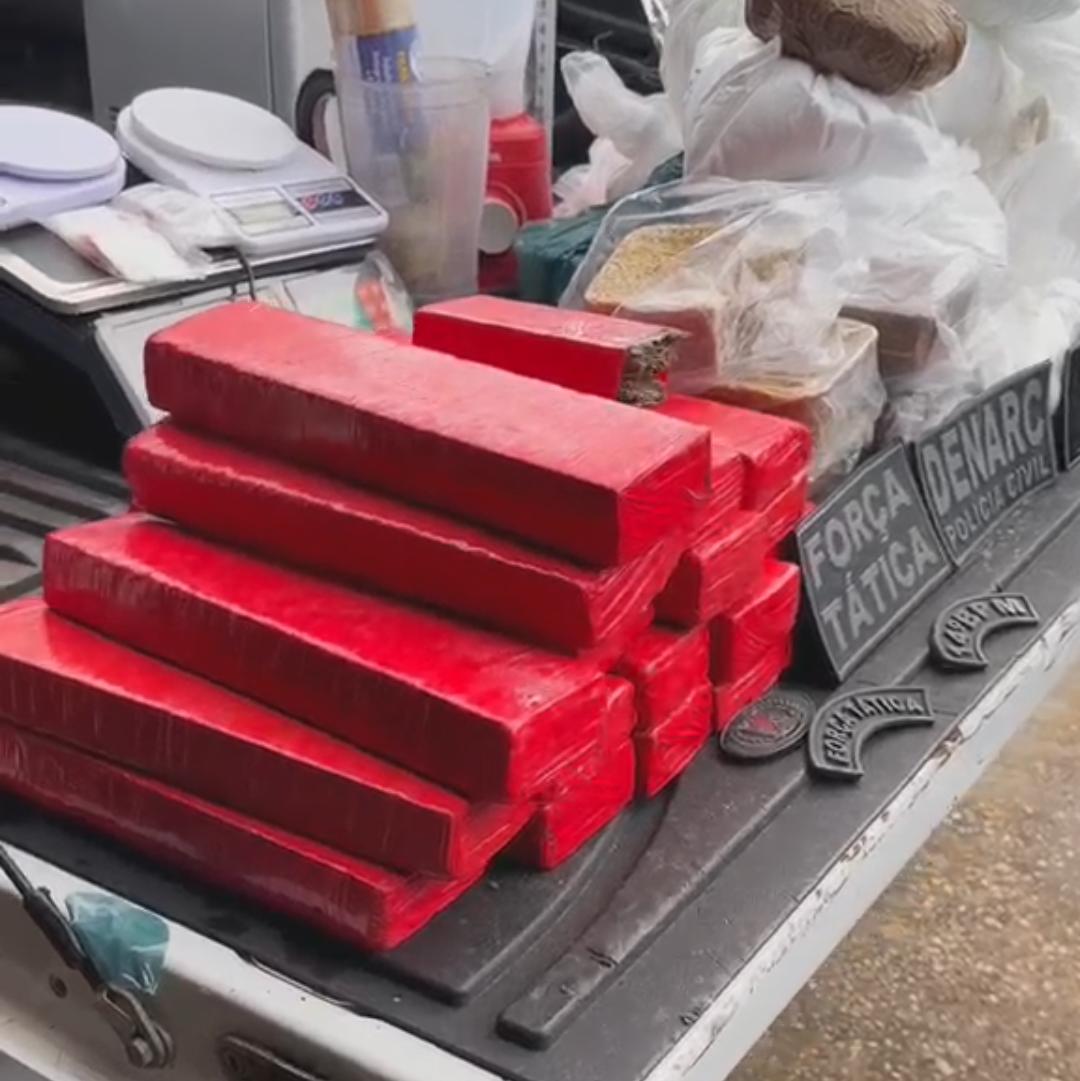 Durante a vistoria no imóvel, os policiais localizaram um ambiente estruturado para o preparo e armazenamento de drogas, com apreensão de quantidade significativa de substâncias ilícitas, além de balanças, prensa hidráulica e outros materiais utilizados na no tráfico.