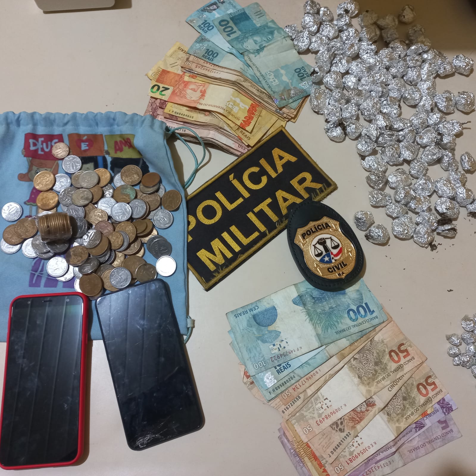 Na residência dos presos, os policiais apreenderam 90 papelotes de maconha,56 papelotes de crack e a quantia de R$ 2.191,00 oriunda da venda da droga. Segundo relatos do familiares dos investigados, a dupla aliciava crianças e adolescentes ao tráfico.