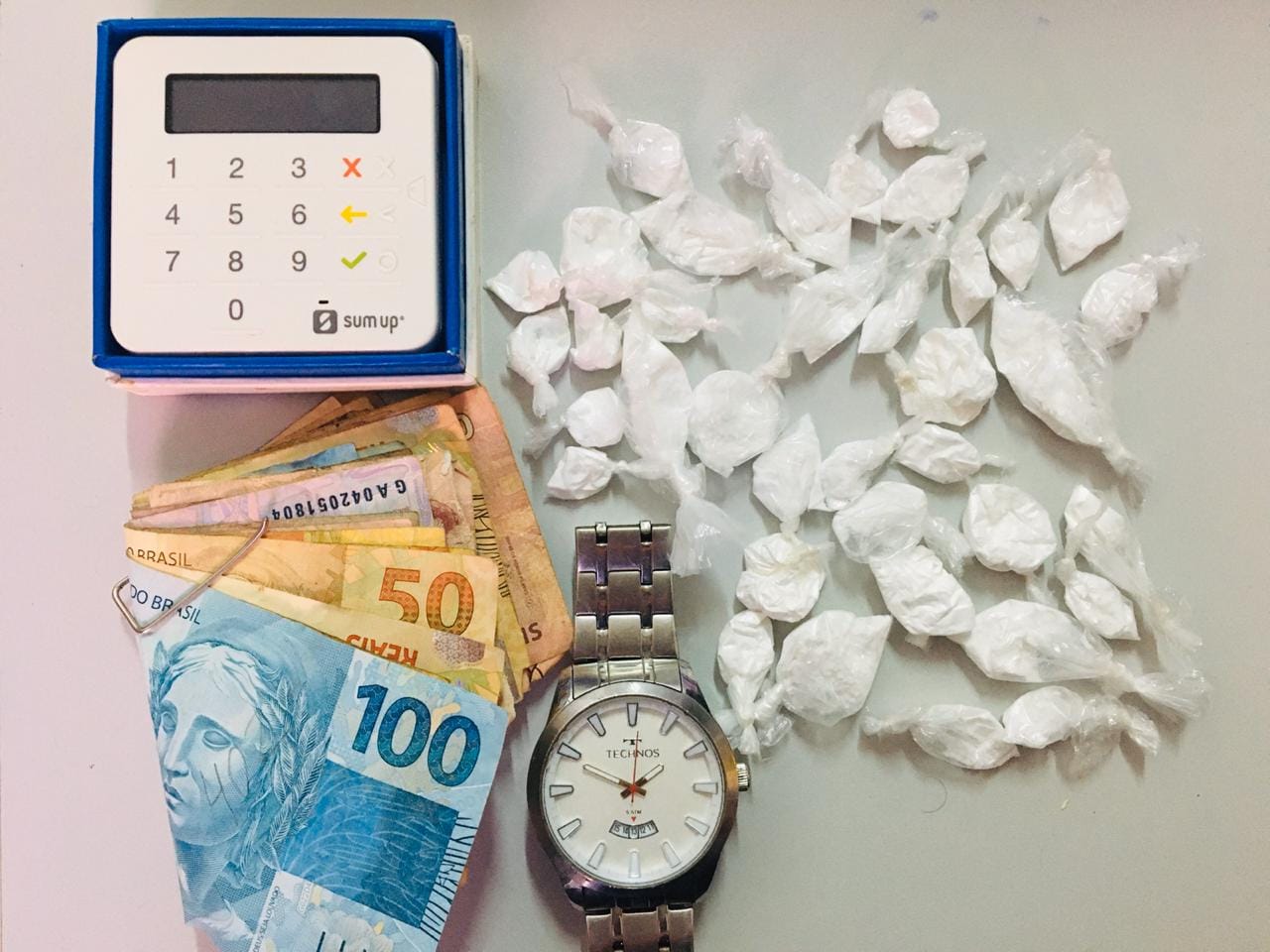 Com E. M. da S. foram encontradas trinta e oito porções de um pó branco, assemelhado à Cocaína, e certa quantia em dinheiro, dividido em cédulas de pequeno valor, situação característica na prática de Tráfico de Drogas. Já com o segundo indivíduo, F.F.M.L, foi encontrada aproximadamente 100g de uma substância verde vegetal, assemelhada à maconha, além de 20g de um pó branco, assemelhado à cocaína, e cerca de 20g de uma substância amarelo sólida, assemelhada ao crack.