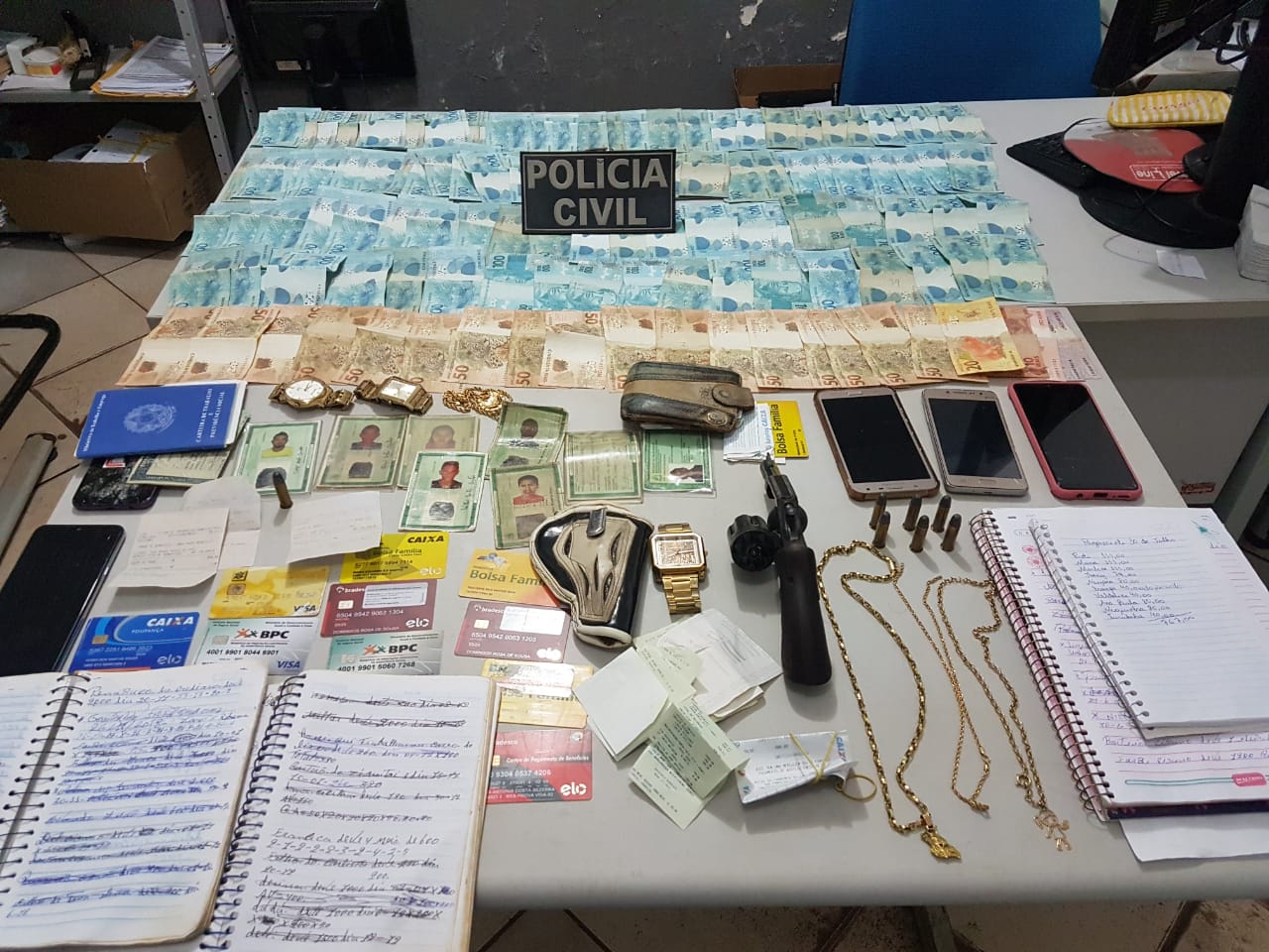 Foram apreendidos três veículos suspeitos, quase R$ 11.000,00 em espécie, uma arma de fogo, munições, celulares, cordões, cartões bancários e de benefícios sociais em nome de terceiros e com senhas, documentos pessoais e cheques de terceiros e anotações de valores de possíveis empréstimos.