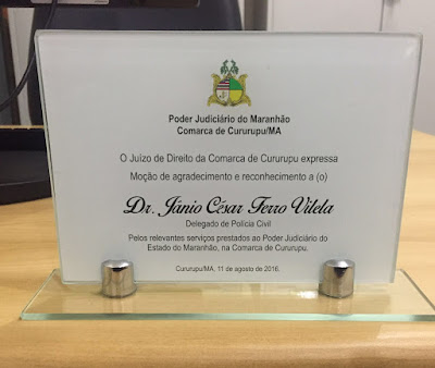 Delegado César Ferro, titular da delegacia da cidade de Cururupu-MA, foi homenageado em uma audiência pública realizada pelo poder judiciário naquela cidade, no dia 11 de agosto 2016, em uma solenidade organizada pelo juiz Douglas Lima da Aguiar e presidida pelo Desembargador Ricardo Dualibe, ouvidor geral do TJ/MA. O delegado recebeu das mãos do MM. juiz de direito Douglas Aguiar, uma monção pelos relevantes serviços prestados, ao Poder Judiciário do Estado Maranhão na comarca daquela cidade.