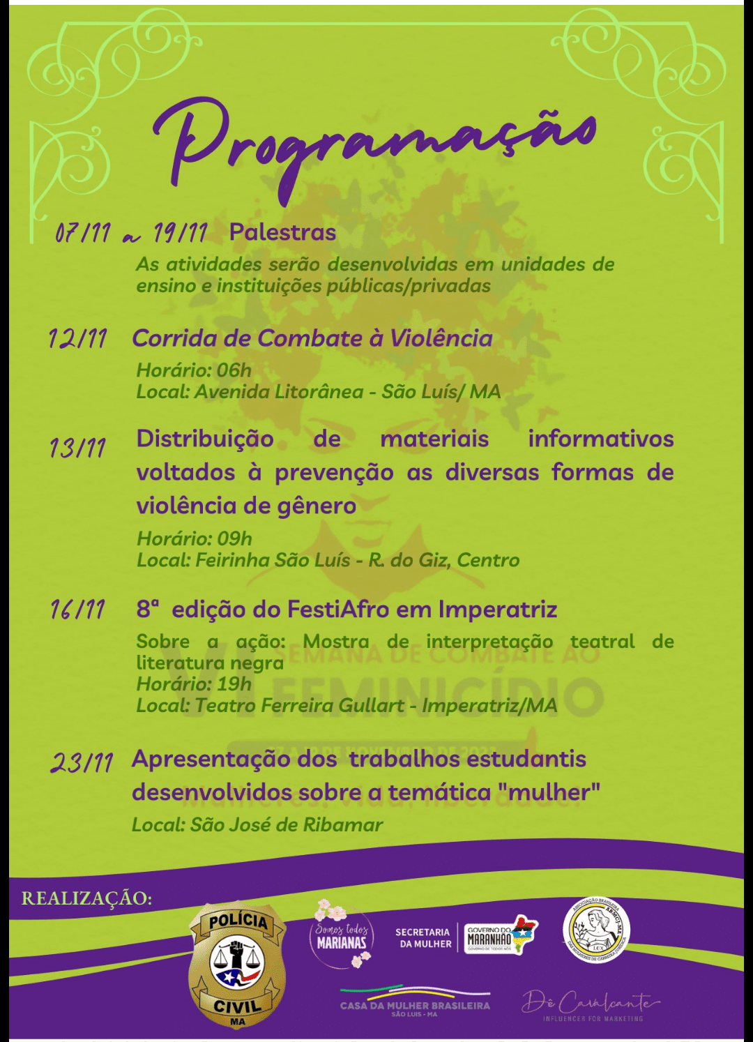 A comissão organizadora da “VI Semana de Combate ao Feminicídio; Mulheres, Vida, Liberdade”, divulgou na última quinta-feira(3), a programação completa do evento que será promovido entre os dias 7 e 23 de novembro na região Metropolitana de São Luís e em Imperatriz.