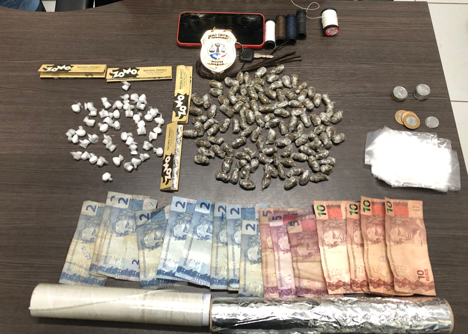 Durante a execução do mandado de prisão, os policiais civis flagraram as duas mulheres com 110 trouxinhas de maconha e 47 trouxinhas e cocaína após tentarem dispersar os entorpecentes. Além das drogas, foram encontrados insumos para a confecção das trouxinhas e dinheiro trocado.