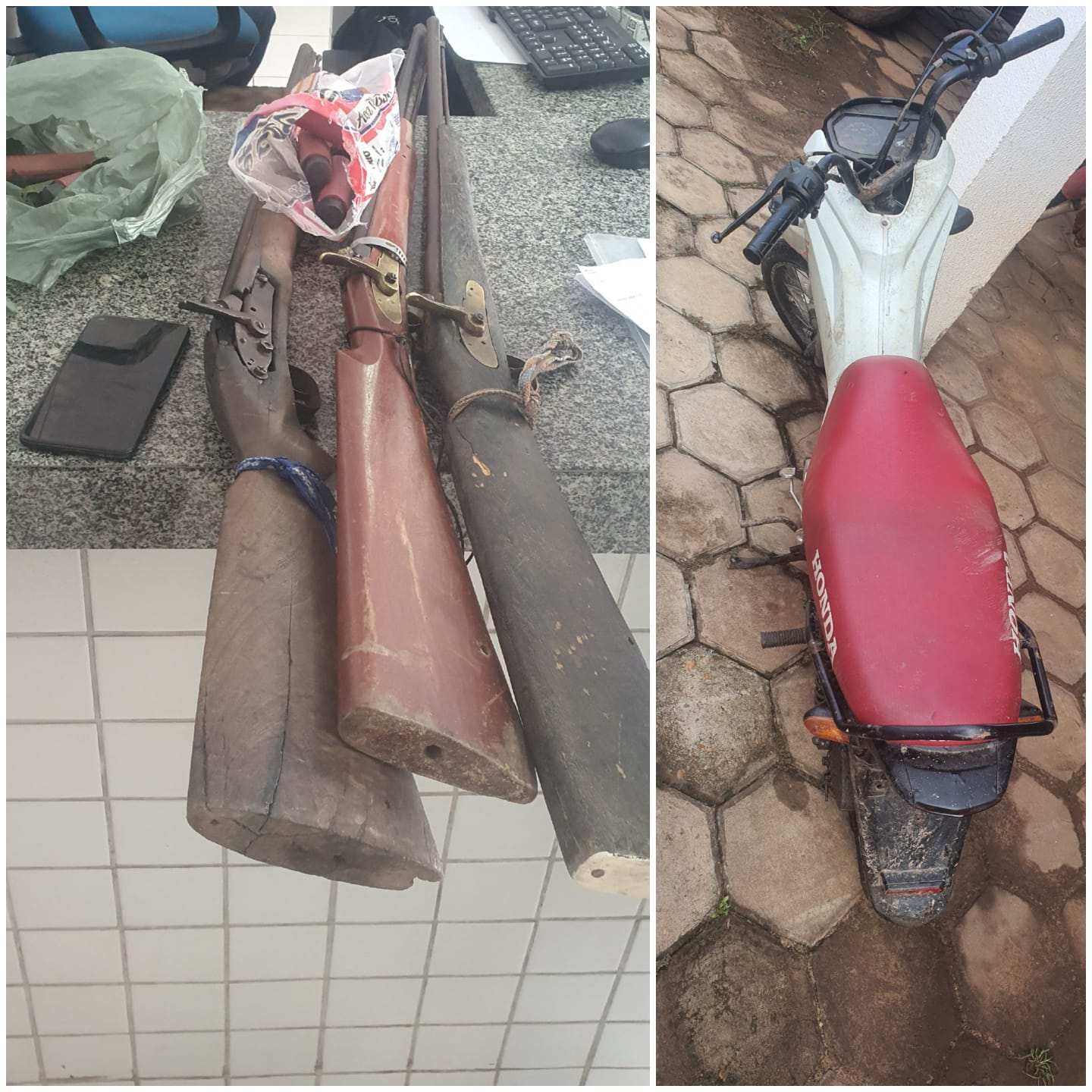 De acordo com o delegado Rafael Rocha, o primeiro mandado de prisão foi cumprido no Povoado Trancado, local de difícil acesso, onde o investigado foi pego em flagrante com uma motocicleta Pop 100 produto de roubo e uma espingarda do tipo bate bucha. O mesmo foi autuado também em flagrante pelos crimes de receptação e posse ilegal de arma de fogo. Ainda segundo o delegado, no imóvel vizinho, os policiais ainda prenderam em flagrante, um segundo homem pelo crime de posse ilegal de arma de fogo, pois mesmo portava uma espingarda bate bucha.