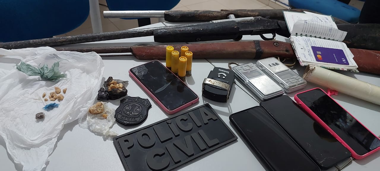 Durante a ação policial realizada na terça-feira, na primeira residência foram localizadas e apreendidas maconha, crack, material para embalagens, balanças de precisão, caderno de anotações, cinco munições intactas de cal. 20 e três espingardas (uma cartucheira e duas de fabricação artesanal), supostamente utilizadas em assaltos na região. Na ocasião, três pessoas foram presas.