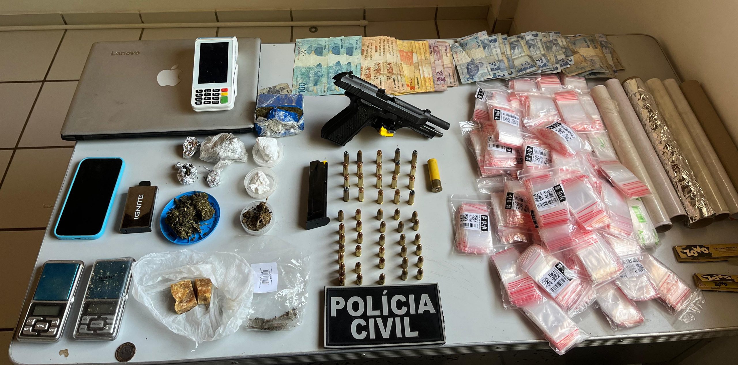 As equipes policiais cumpriram diligências em três endereços, onde localizaram armas de fogo, entorpecentes, munições, aparelhos de celular, dinheiro em espécie e diversos materiais utilizados para embalar drogas.