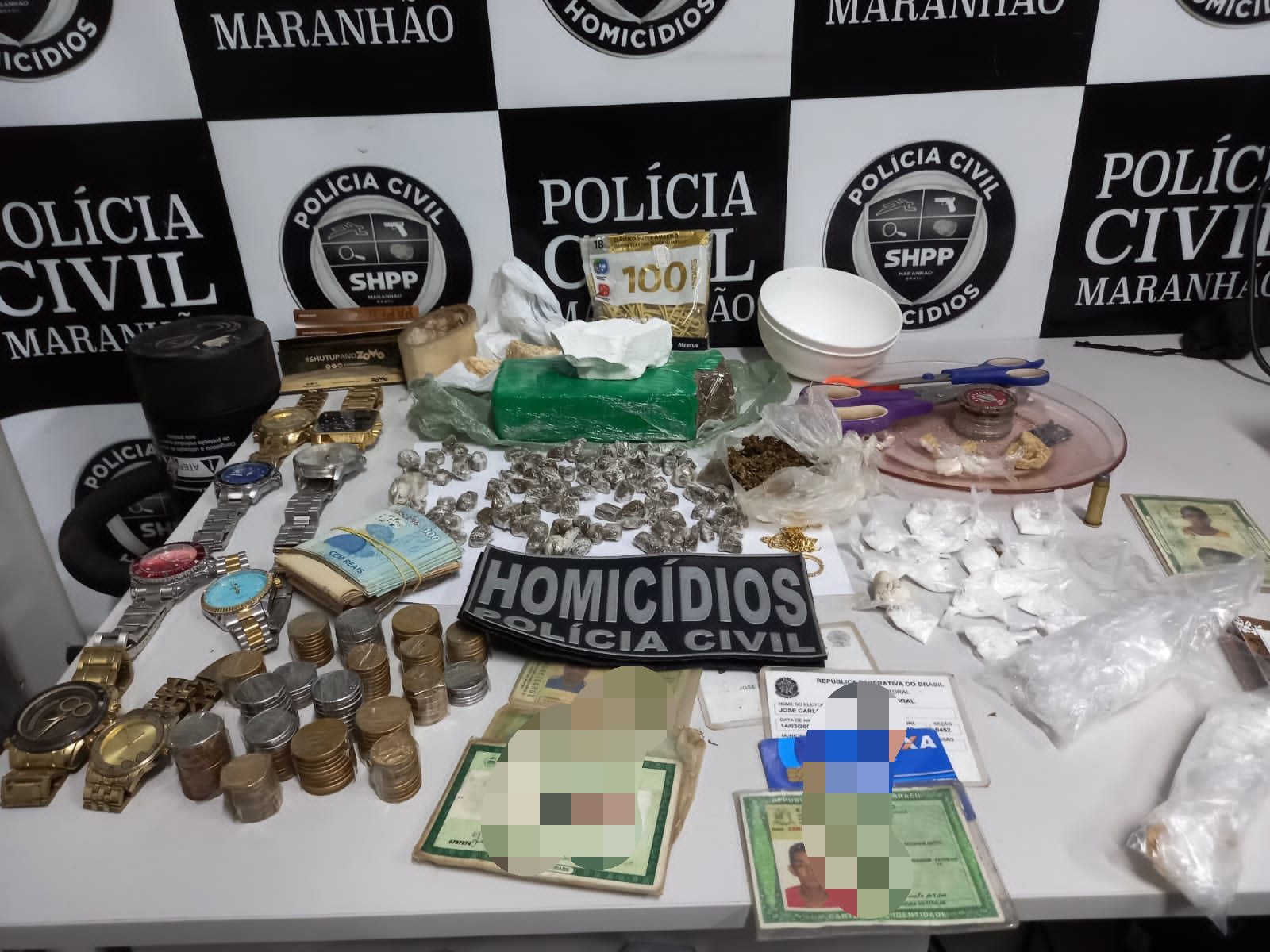 A prisão foi realizada por policiais civis da Delegacia de Homicídios e do 1º Distrito Policial de Timon que ainda conseguiram apreender na residência do investigado, no bairro Cidade de Deus, quantidades expressivas de maconha, crack, cocaína, dinheiro, material para embalar drogas, relógios e munição calibre .38.