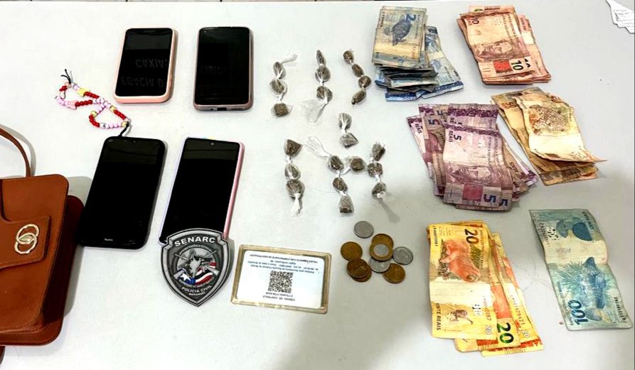 Durante o cumprimento de busca domiciliar, a mulher de 52 anos, estava na companhia de dois adolescentes, e em poder deles foram apreendidos 22 invólucros de maconha acondicionadas para venda; 04 aparelhos celulares roubados nos municípios de Caxias e Aldeias Altas e uma quantia de 862 reais em notas trocadas.
