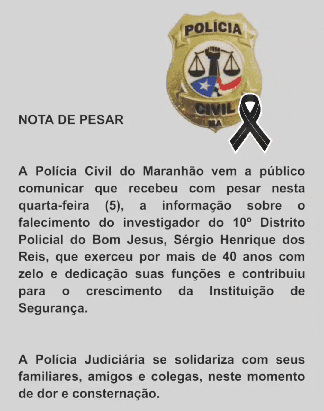A Polícia Civil do Maranhão vem a público comunicar que recebeu com pesar nesta quarta-feira (5), a informação sobre o falecimento do investigador do 10º Distrito Policial do Bom Jesus, Sérgio Henrique dos Reis, que exerceu por mais de 40 anos com zelo e dedicação suas funções e contribuiu para o crescimento da Instituição de Segurança.