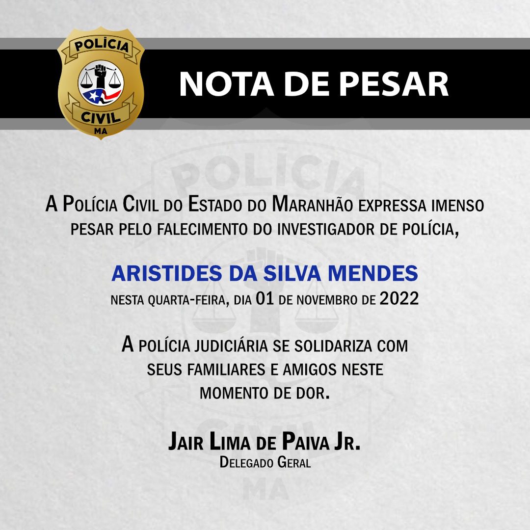 Notícias NOTA DE PESAR ASCOM PC/MA 2 de novembro de 2022 277 FacebookTwitterE-mailWhatsApp A Polícia Civil do Maranhão expressa imenso pesar pelo falecimento do investigador de Polícia,Aristides da Silva Mendes , nesta quarta-feira (1). A Polícia Judiciária se solidariza com seus familiares e amigos neste momento de dor.
