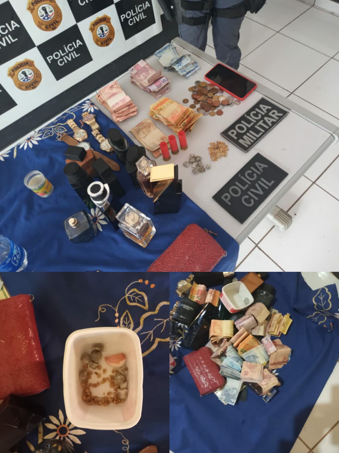 Entre os materiais apreendidos estão joias, 12 perfumes, cartuchos deflagrados de calibre 12, 59 unidades de crack, 09 unidades de maconha e uma aparelho de celular. Diante dos fatos, os policiais também decretaram a prisão em flagrante da mulher que foi levada à Delegacia de Polícia, e posteriormente recambiada a uma unidade prisional da região.