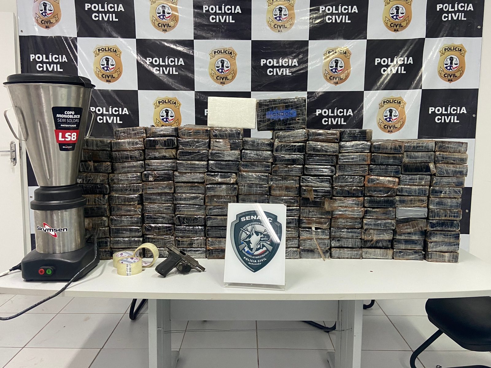 Em uma ação realizada na noite da última quarta-feira(21), a Polícia Civil do Maranhão conseguiu, apreender 166 quilos de cocaína que estavam armazenados em um terreno baldio próximo a um galpão, localizado no bairro Matinha, em São José de Ribamar. Na ação policial que foi coordenada pela Superintendência Estadual de Repressão ao Narcotráfico(SENARC), os investigadores ainda prenderam um homem de 25 anos , além de apreender uma arma de fogo tipo pistola calibre 380, bem como vários petrechos para refino e embalagem de drogas.