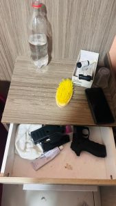 Durante o cumprimento do mandado, os policiais encontraram uma pistola calibre 9mm, dois carregadores e 26 munições do mesmo calibre.