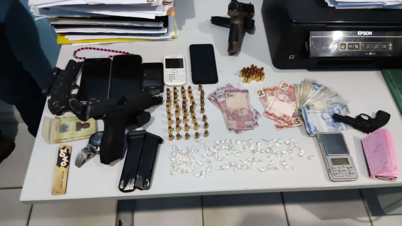 Os três presos foram autuados pelos crimes de tráfico de drogas, associação ao tráfico, porte de arma (380) e porte com supressão da numeração (9mm), sendo está última com capacidade de rajada, ou seja, arma semiautomática.