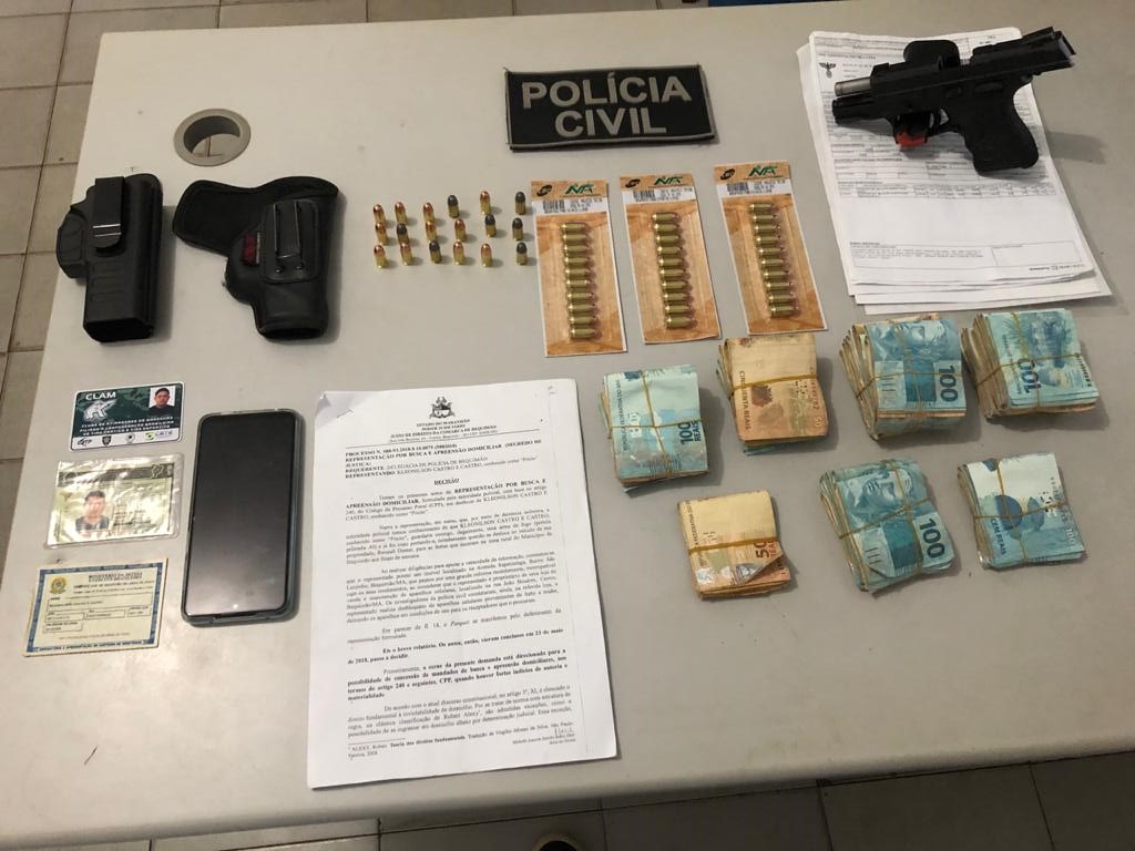 Durante as buscas foram encontradas uma pistola calibre .380, municiada com 18 munições; três cartelas de munições calibre .380 e uma quantia em dinheiro de, aproximadamente, quarenta mil reais.