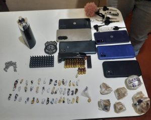 Durante a operação, foram apreendidos carregadores, munições de arma de fogo de uso restrito (calibre .40), entorpecentes, aparelhos celulares, entre outros materiais ilícitos. Além disso, quatro pessoas foram presas em flagrante e encaminhadas à unidade policial, onde permanecem à disposição da Justiça.