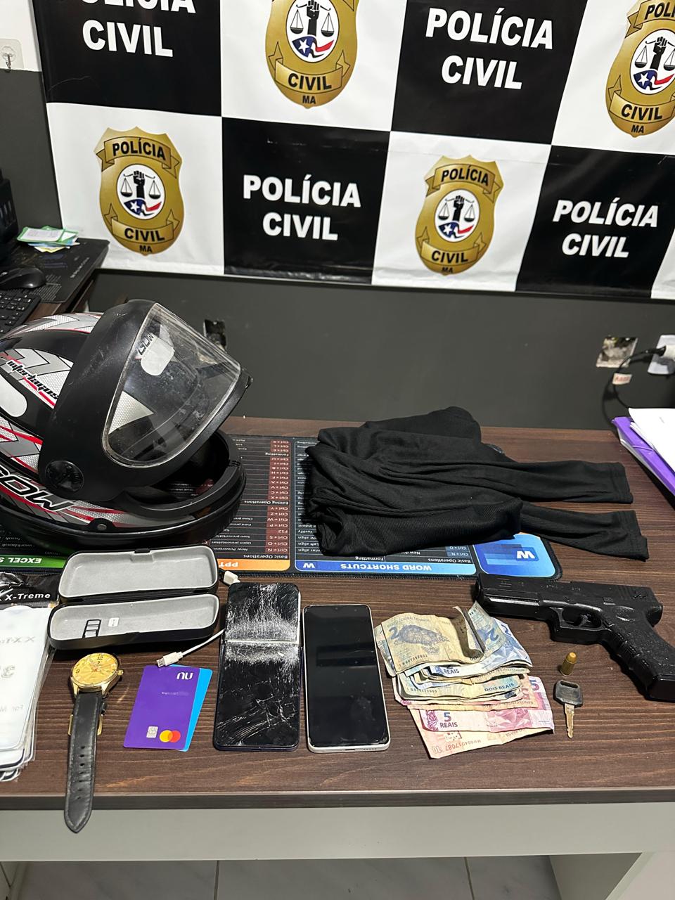 No imóvel, os policiais apreenderam diversos objetos relacionados ao crime, entre eles uma (01) réplica de arma de fogo, o capacete utilizado no assalto, uma (01) camisa usada pelo suspeito no momento da ação criminosa, alguns cartões bancários, uma munição calibre .40, dinheiro e dois (02) aparelhos celulares.