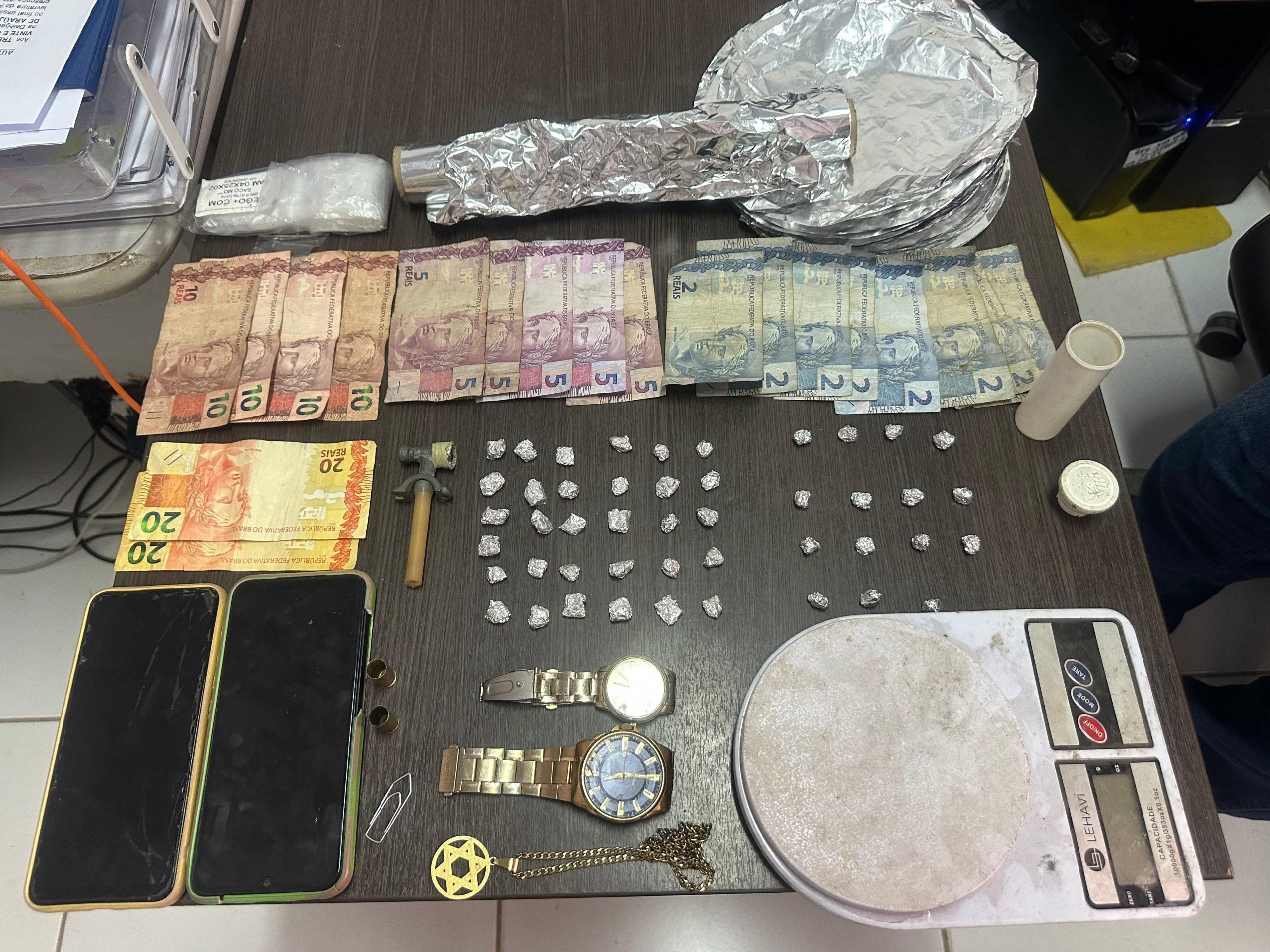 Além da droga apreendida, foram localizados diversos materiais utilizados no tráfico, como uma balança de precisão, dinheiro trocado, embalagens de papel alumínio e um cachimbo.