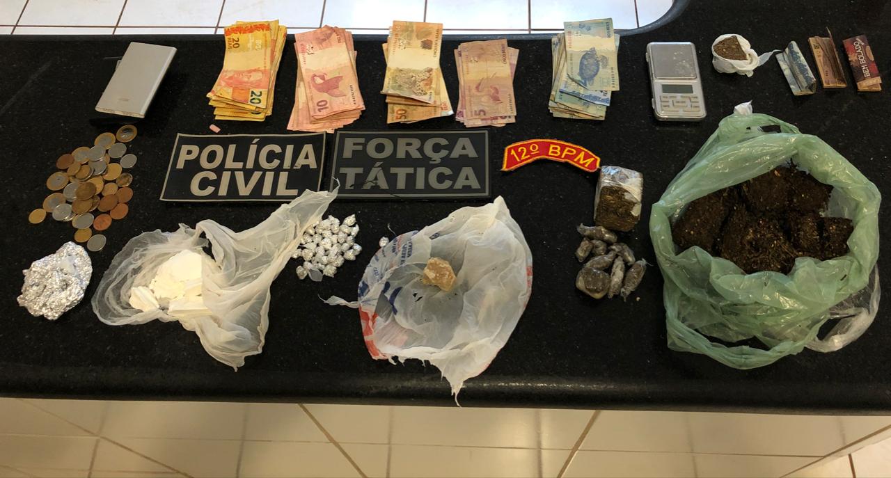 Em uma das residências alvo da busca, foram localizados aproximadamente 32 gramas de substância assemelhada ao entorpecente conhecido como crack, 74 gramas de cocaína, 293 gramas de maconha prensada, a quantia de um mil e cinquenta reais em notas fracionadas, uma balança de precisão, cadernos de anotações, além de embalagens utilizadas para acondicionar entorpecentes.