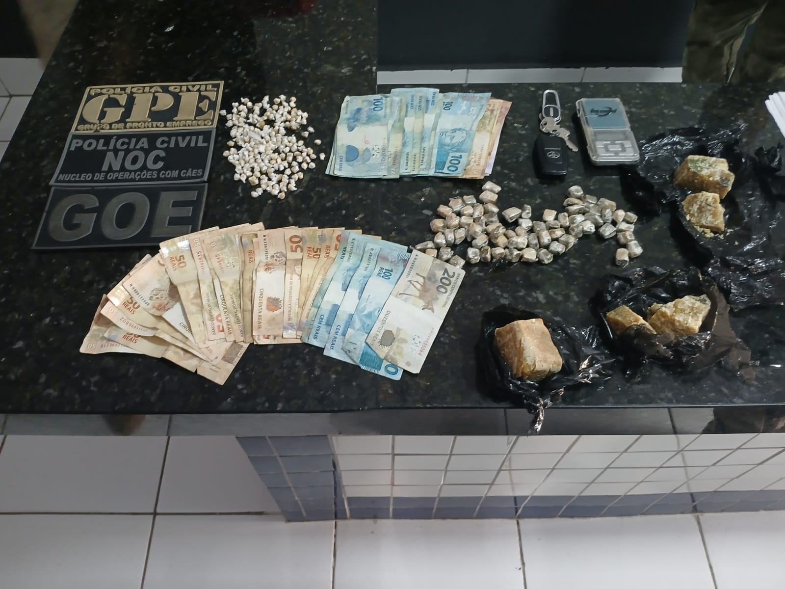 No decorrer das diligências, os policiais apreenderam quantidades expressivas de entorpecentes, entre crack e maconha, já prontos para comercialização, além de seis munições, a quantia de R$ 3.454,00 em dinheiro e dois veículos.