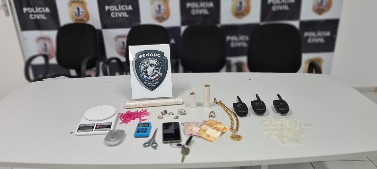 Conforme informações da Superintendência Estadual de Combate ao Narcotráfico (SENARC), foram apreendidas com o suspeito, seis porções de tamanhos variados de “Maconha” já embaladas para a venda, além de duas balanças de precisão utilizadas para a pesagem da droga, petrechos para embalagem do entorpecente e uma máquina de cartão de crédito/débito utilizada para receber pagamentos decorrentes da venda de drogas.