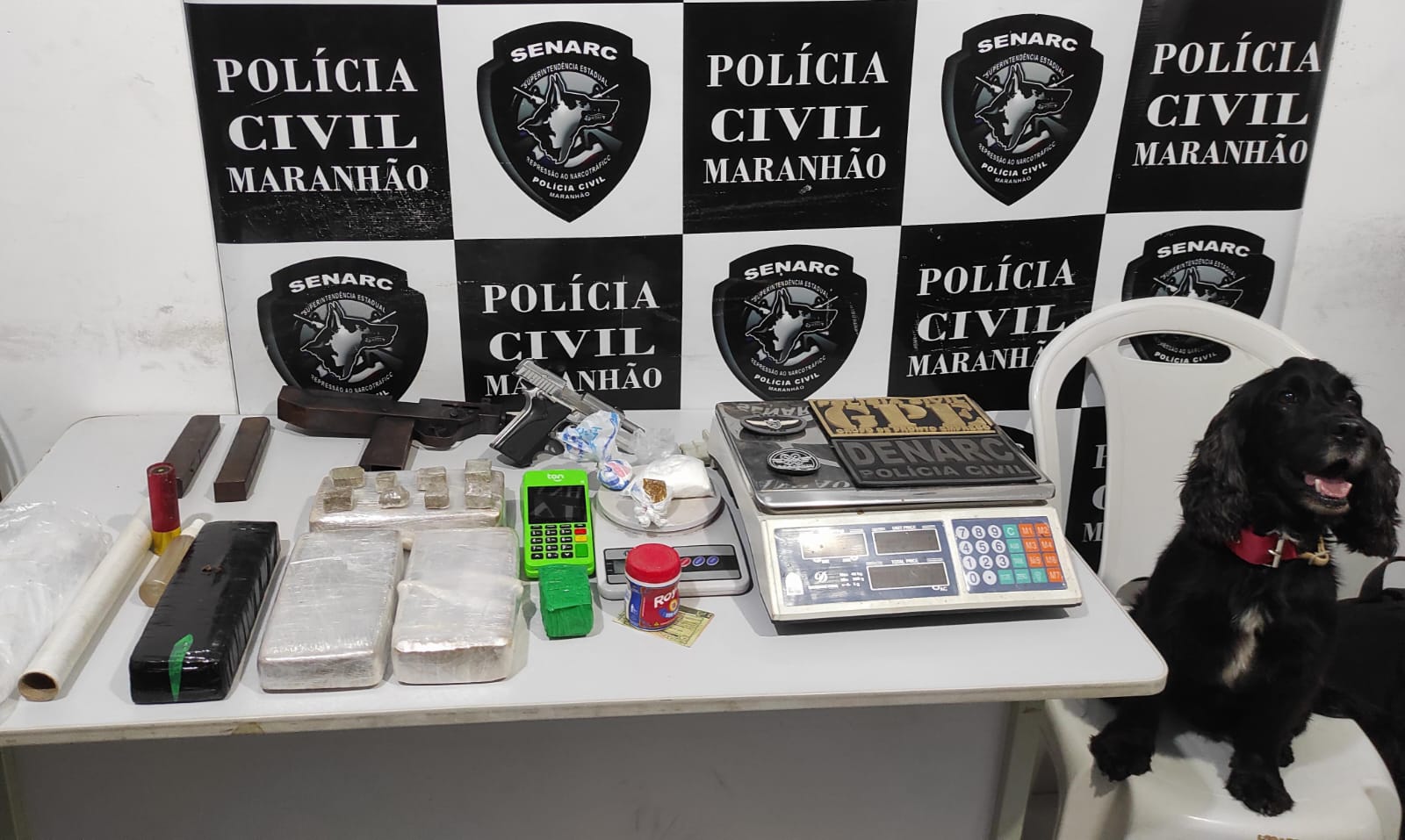 Ainda de acordo com o delegado titular da SENARC, no endereço que servia como esconderijo da droga, os investigadores com apoio do cães farejadores, conseguiram aprender, 3,1 quilos de “crack; 800 gramas de maconha; 115 gramas de “cocaína”; 01 pistola, calibre .380; 01 sub metralhadora, de calibre .9mm; munições de diversos calibres e apetrechos utilizados no tráfico de drogas.