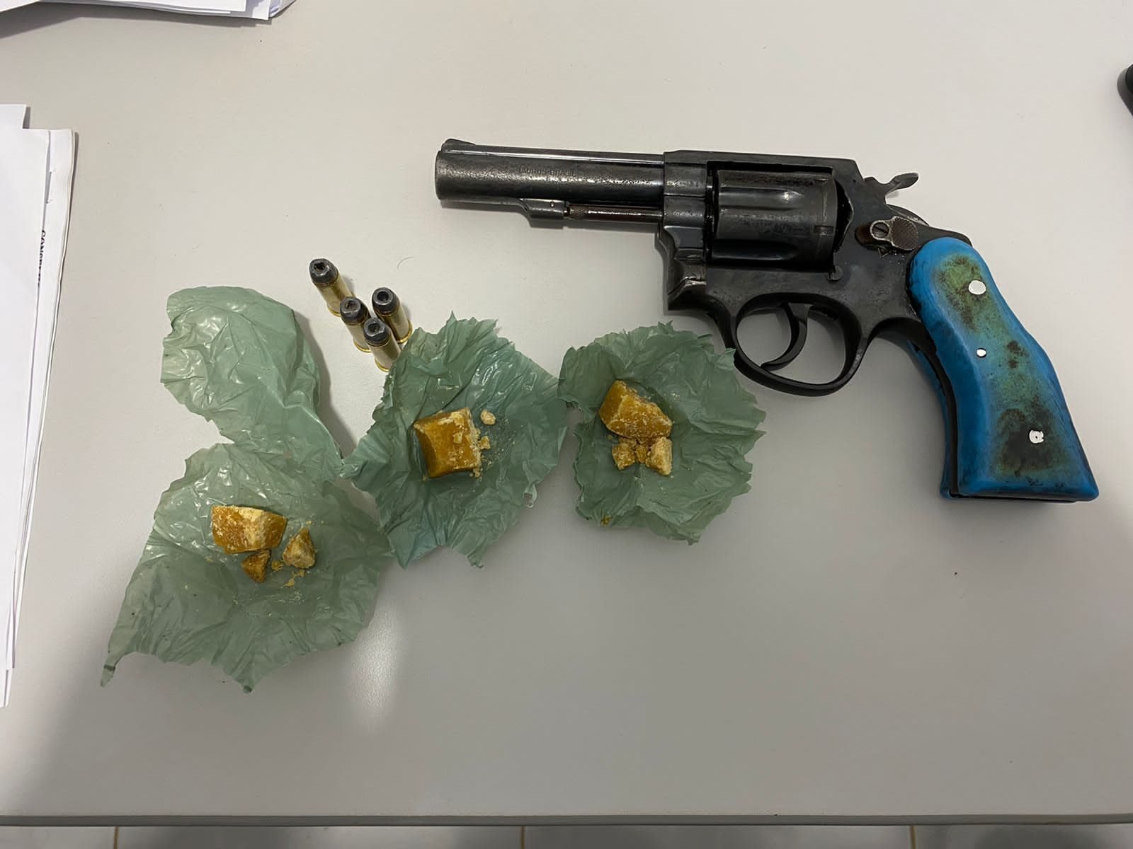 Sabendo da possibilidade estar o indivíduo portando arma de fogo e drogas, os policiais cercaram o quarteirão e conseguiram captura-lo na rua, por trás da casa. Na posse do suspeito foi encontrada uma arma de fogo, calibre 38 e considerável quantidade de substância semelhante ao entorpecente crack (15 gramas).